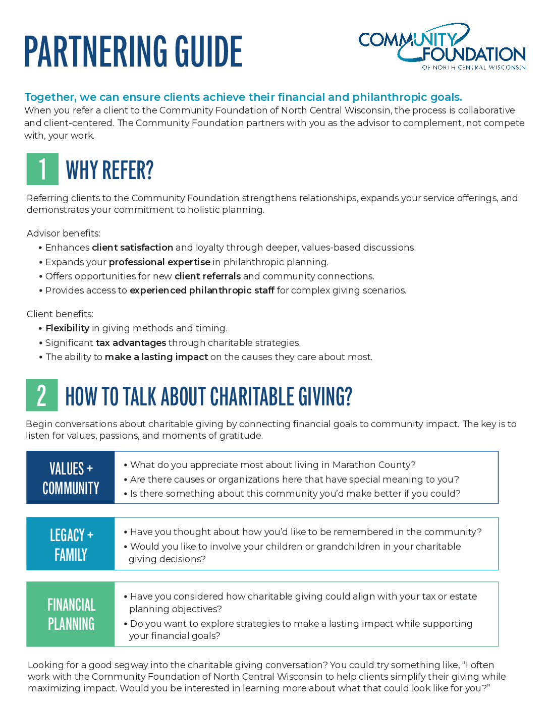 Our goal is to equip you with resources that help you accomplish your clients’ financial and philanthropic goals in a uniquely personal way. Utilize and download the toolkit documents below, designed to help you find the information you need to guide your clients along their philanthropic journey.